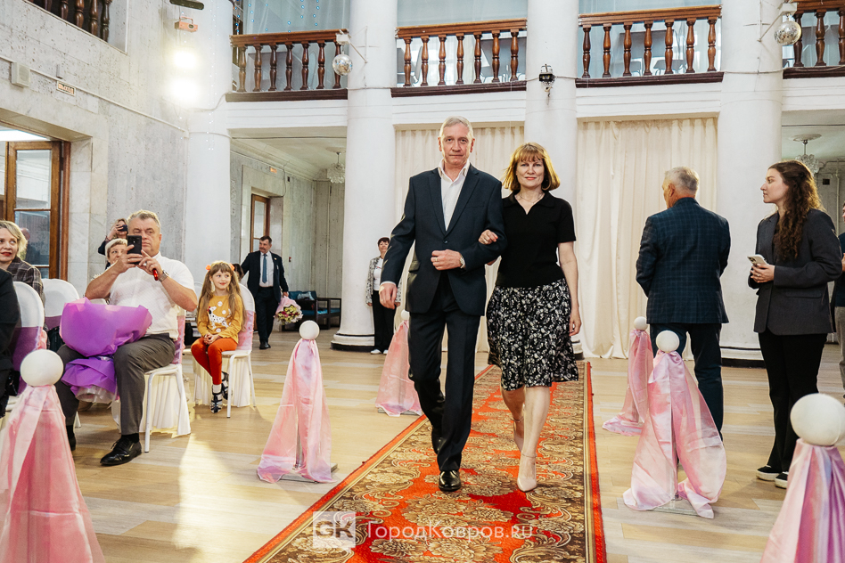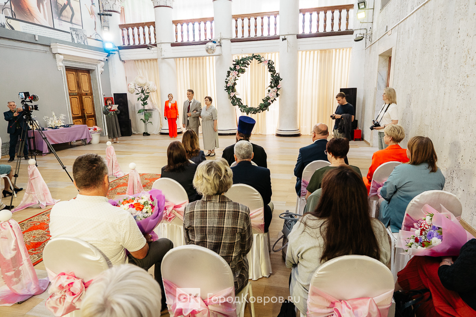 В Коврове церемония уже несколько лет проводится в фойе ДК имени Ленина, которое декорируют так же, как это делается во время выездных бракосочетаний. Белые стулья, задрапированные розовым шелком, символическая арка из цветов, представитель ЗАГСа, — всё относит супругов-юбиляров ко дню их свадьбы.