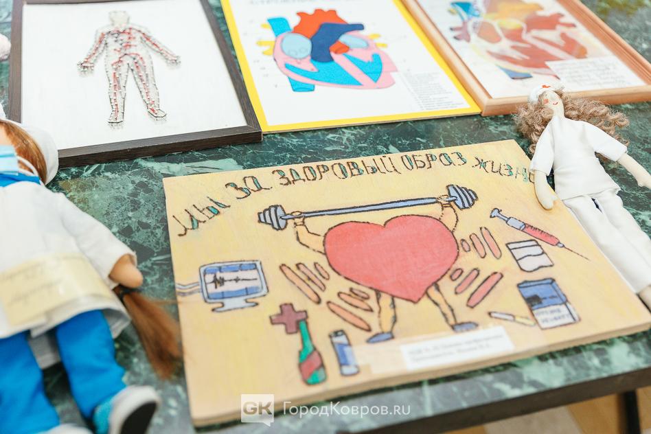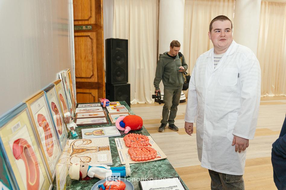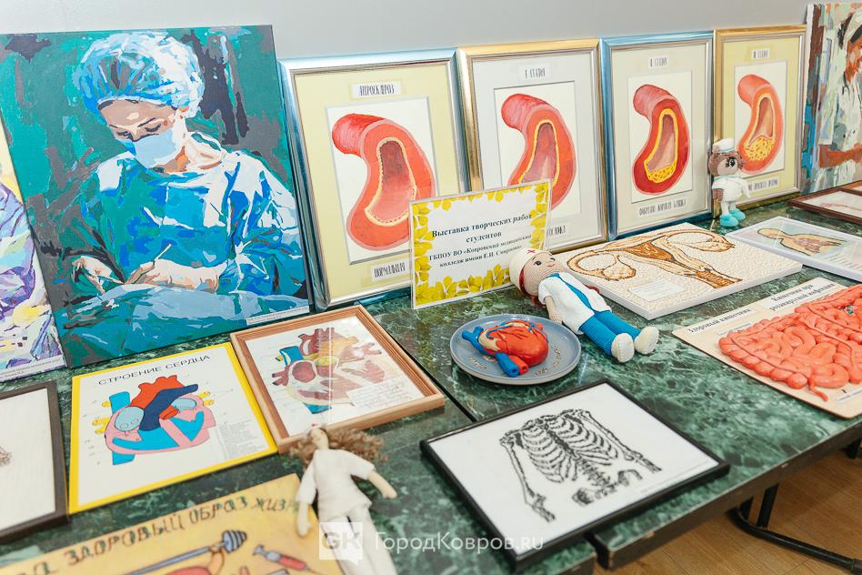 Во-первых, выставка работ студентов. Всевозможный хэндмейд — от картин из бисера до изделий ручной вязки. Тематика медицинская. Кишечник из пластилина, сердце из шерсти, другие органы человека из натянутых на гвоздики нитей.