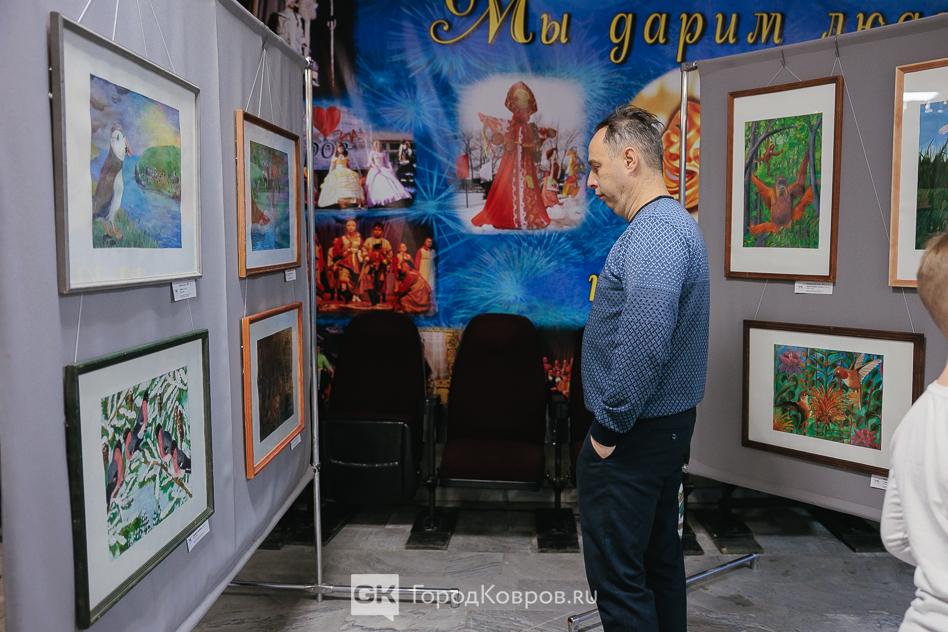 В фойе развернулась тематическая экспозиция. Стенды с фотографиями коллективов, выставка изостудии «ШтрихКот» — картины юных ковровских художников и даже галерея из манекенов в костюмах, изготовленных для творческих выступлений театра моды «Стиль».