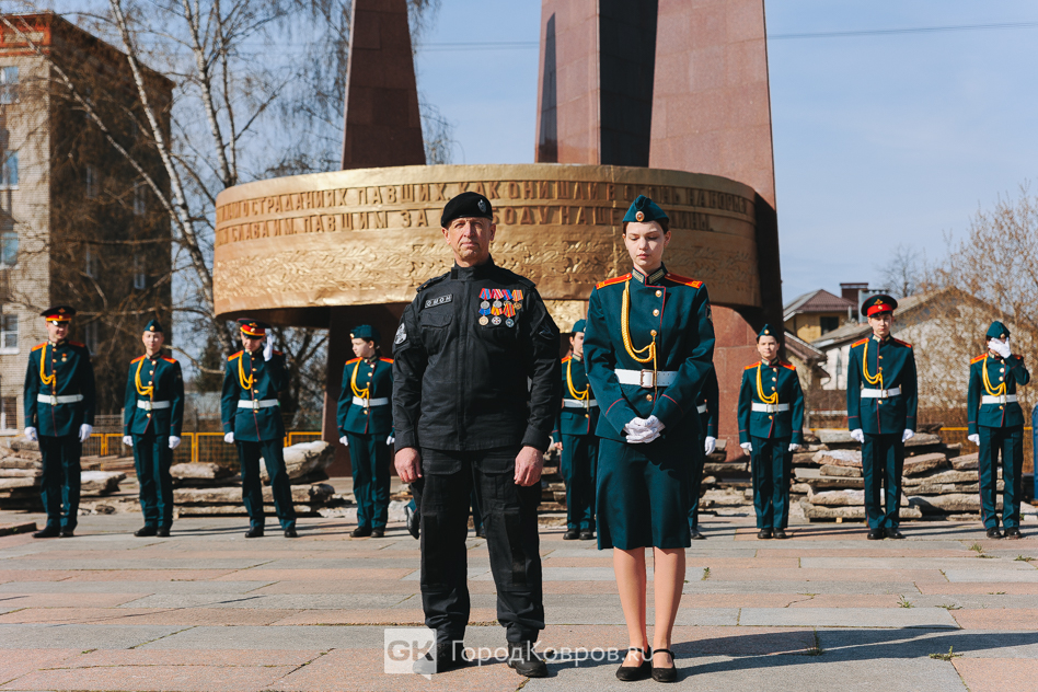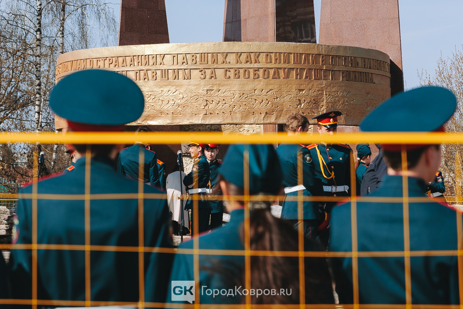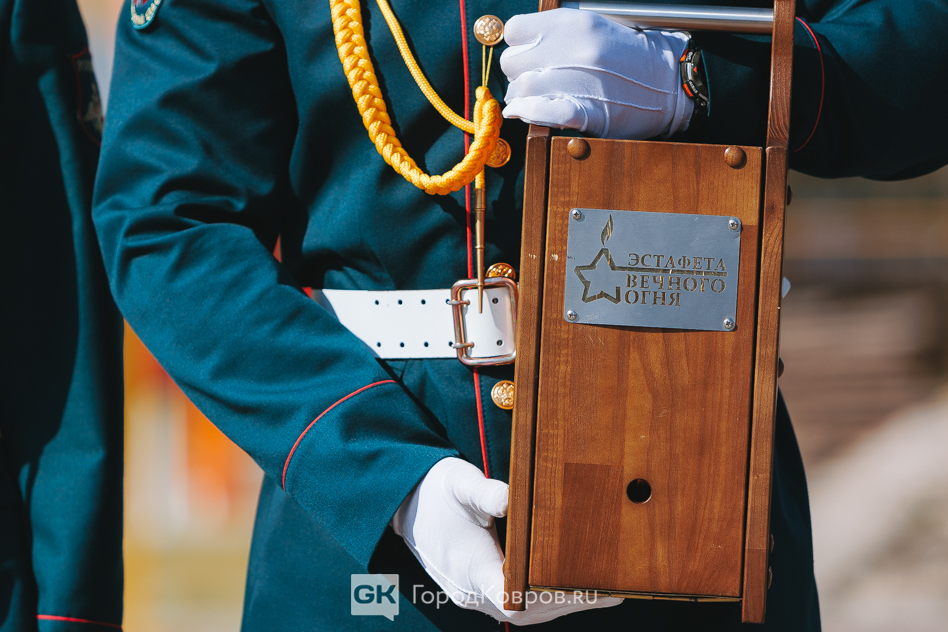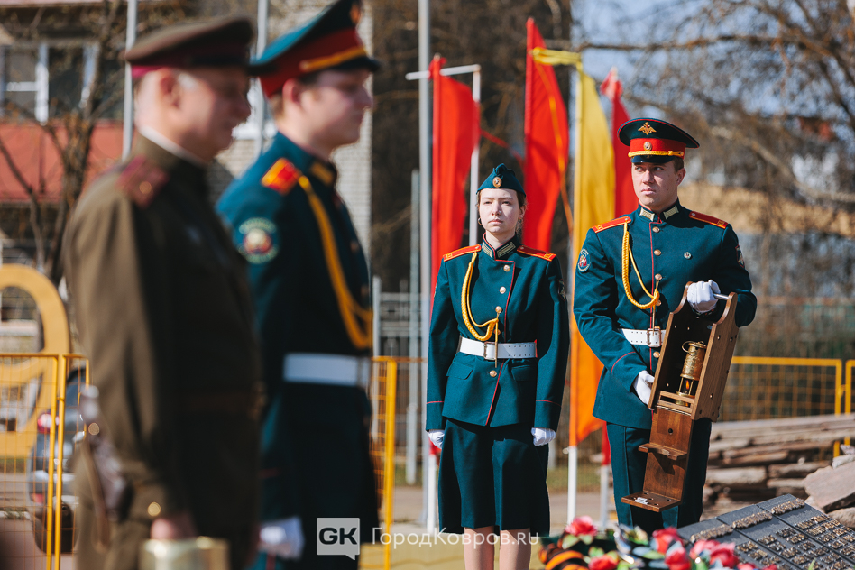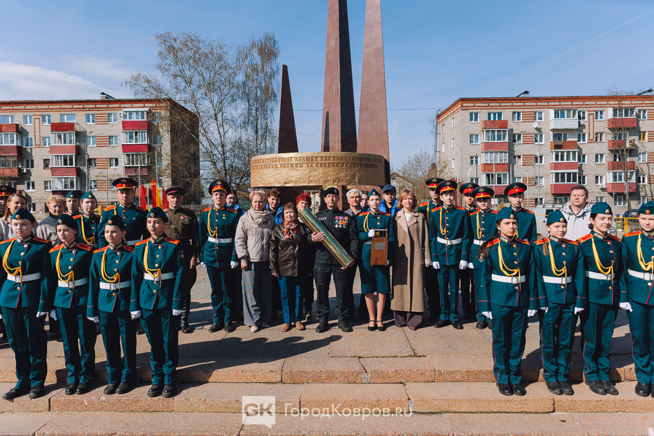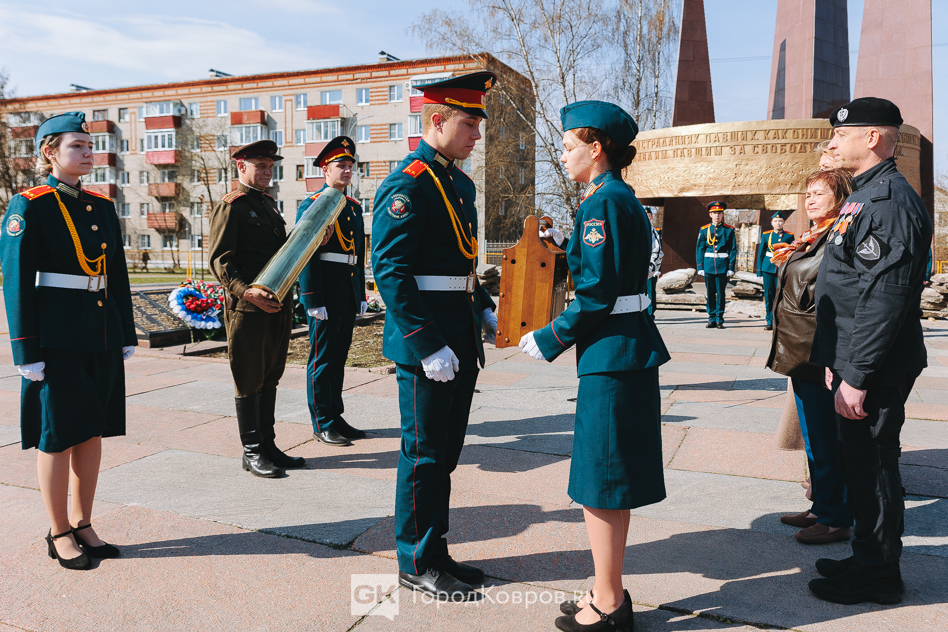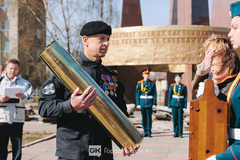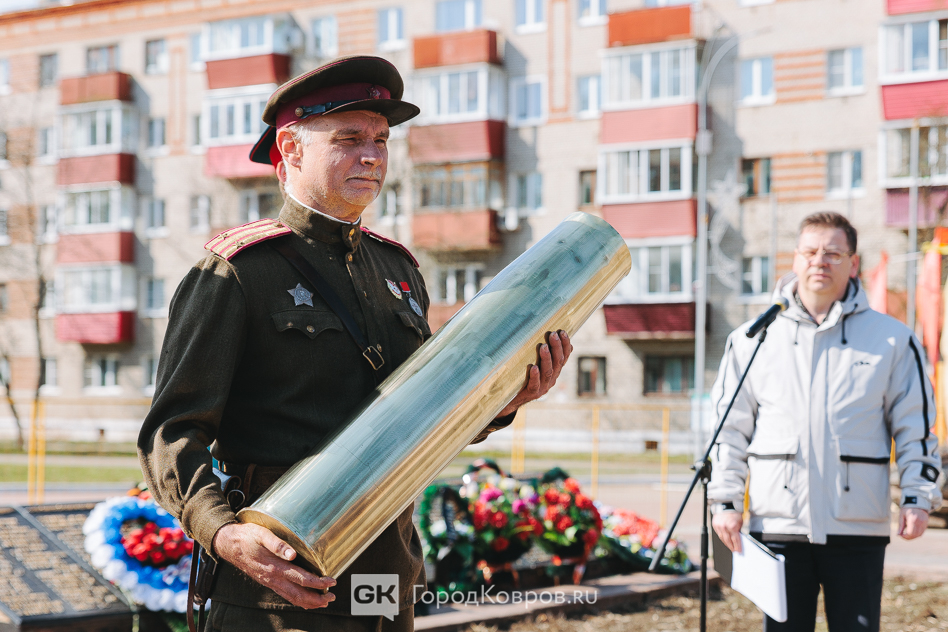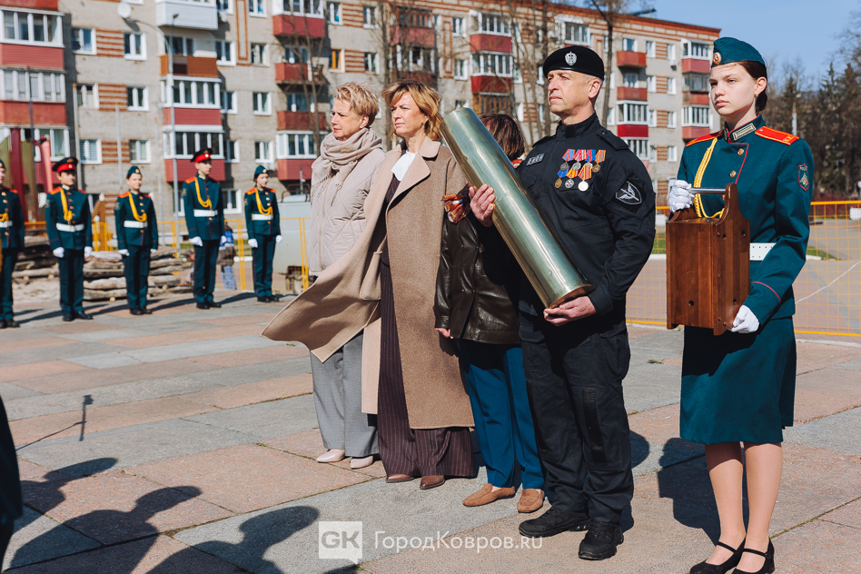 Кульминацией стало внесение двух капсул. Одну — с частицей Вечного огня — вынесли реконструктор и кадет. Вторую — с землёй с захоронения воинов Великой Отечественной, умерших от ран в госпиталях Коврова, — тоже торжественно пронесли под стихи ведущего. Глава города и председатель горсовета передали капсулы участнику СВО и кадету.
