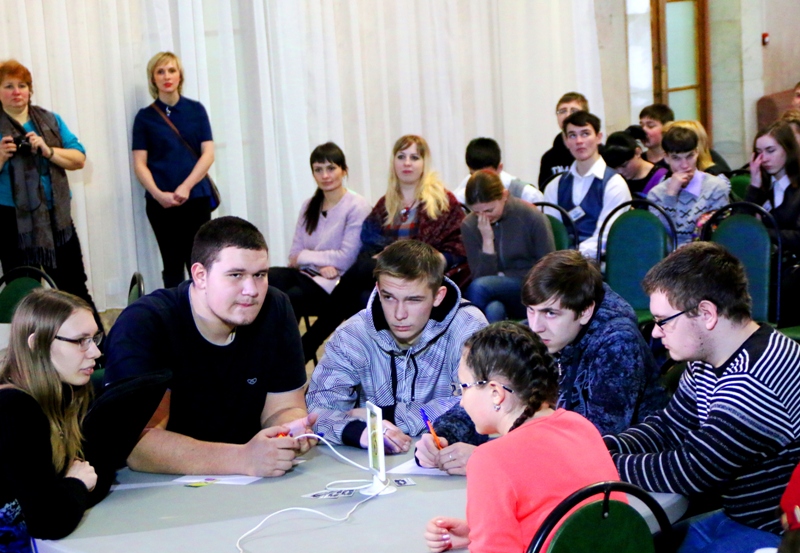 В игре – 4 команды. «Одуванчики», «Фиксики», «Юристы» и «Анархия». Зрительный зал тоже заполнен. Значит так, вот блокнот, записывай вопросы и ответы. Если не выиграем, будем тренироваться, пока не победим, — наставляет педагог колледжа одного из особо активных членов группы поддержки. В зоне зрителей сидят и бывалые участники проекта.