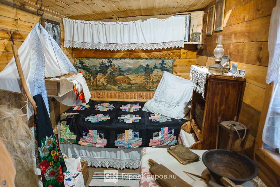 Ещё одним собранием семейных реликвий стала реконструкция комнаты в крестьянской избе. Почти всё настоящее – от деревянной колыбели до вышитых салфеток.