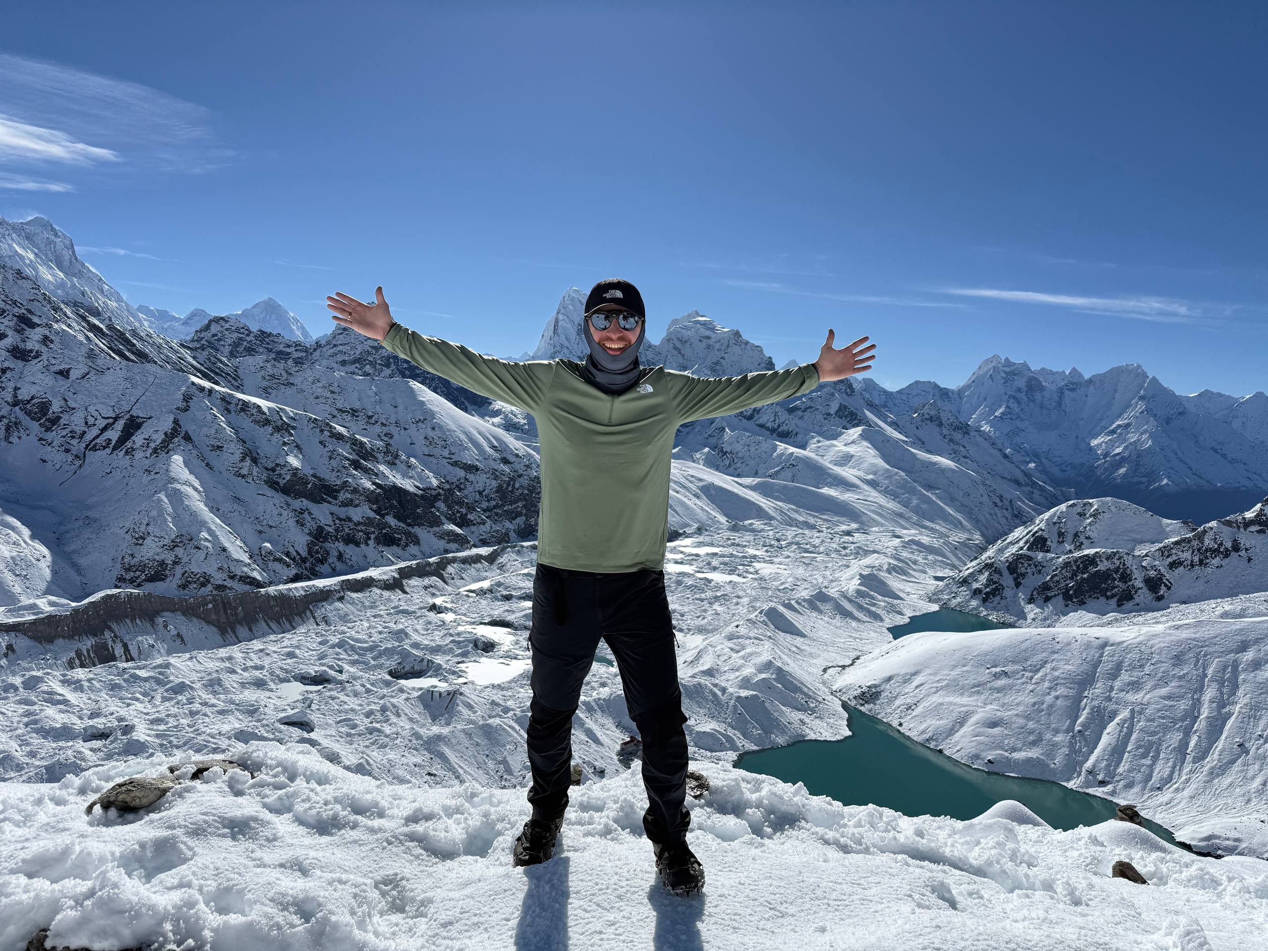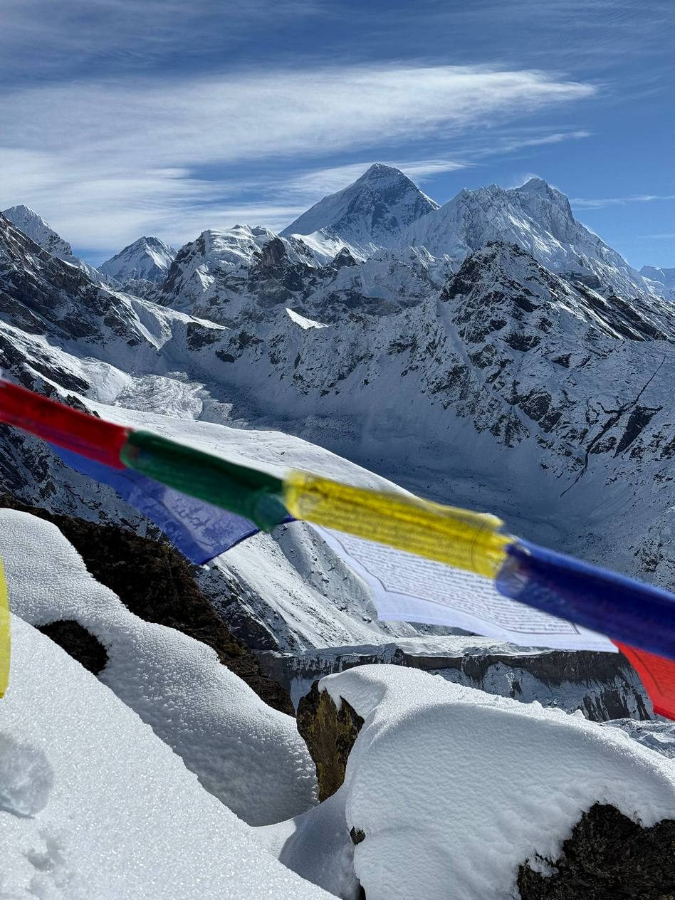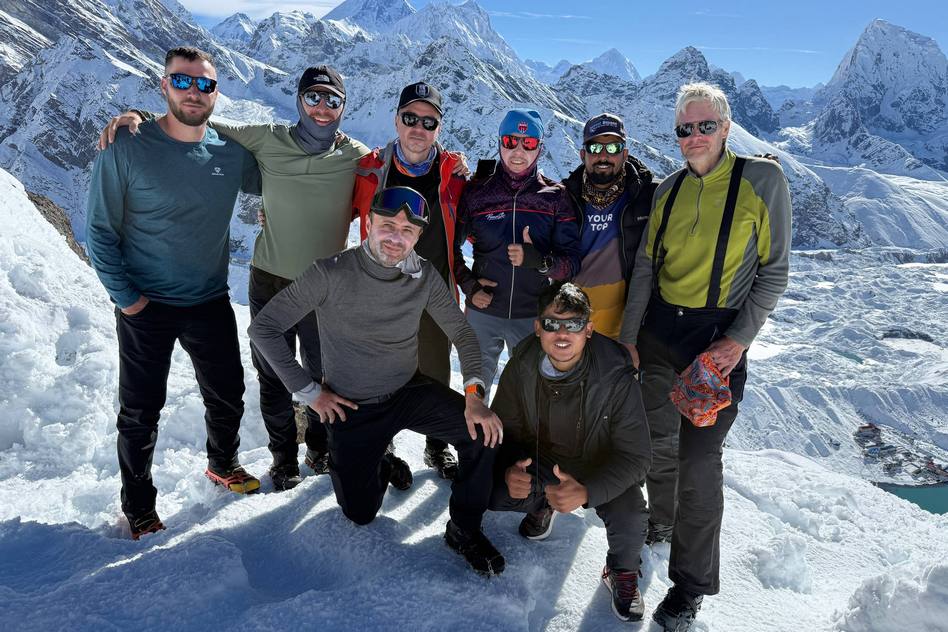 - «9 октября. В 5:00 акклиматизационный выход на Гокио Ри 5350 м. Вся наша команда взошла на вершину. Попили чай, сделали фоточки. Зафиксировали высоту. Дальше нас ждал спуск и плотный завтрак в нашей лоджи. Было принято решени перейти на ночевку в поселение Драгнаг , так как завтра нас ждет переход через перевал Cho la. Днем он более опасен, поэтому будем проходить рано утром. Мы все ближе и ближе к своей первой цели пик Лобуче 6119 м»/