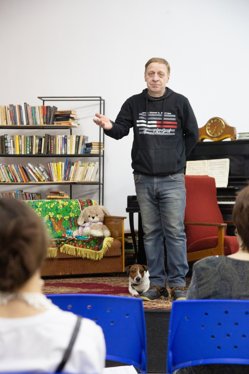 — Очень много. По три раза в неделю прогоняли спектакль полностью. Кроме того, у нас были занятия по актёрскому мастерству, импровизации — спасибо Михайлову за этот опыт и помощь. Хотя пару раз коса находила на камень, и я срывался, уходил с репетиций. В целом было весело, хотя немного неловко — моментами чувствовал себя стариком в окружении молодых актёров.