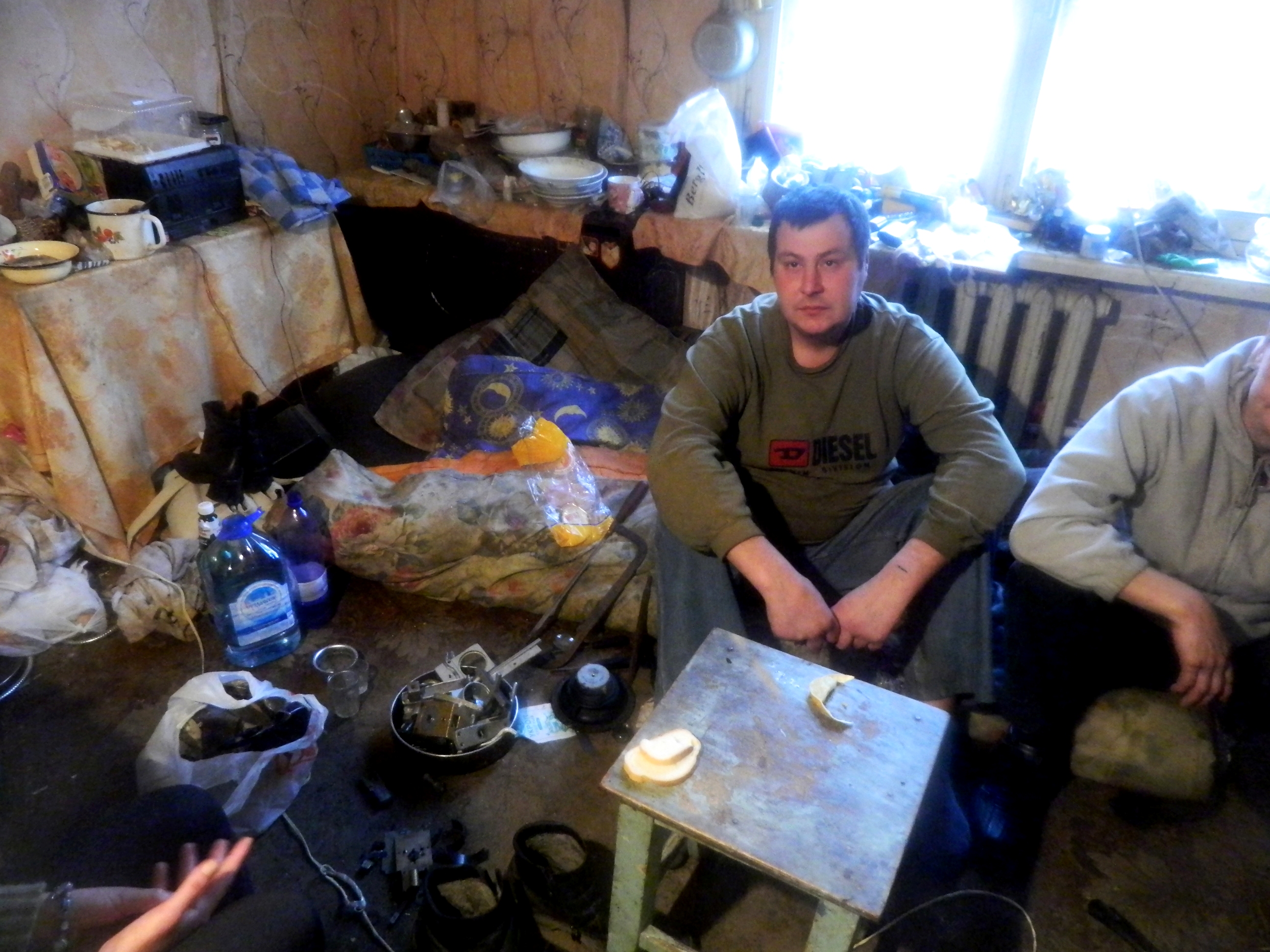 Следующая квартира. Подопечные разместились на полу в маленькой комнатушке. Уже привычный глазу «асоциальный» интерьер не вызывает удивления. В комнатушке так жарко от электроплитки, что запотел объектив фотоаппарата.