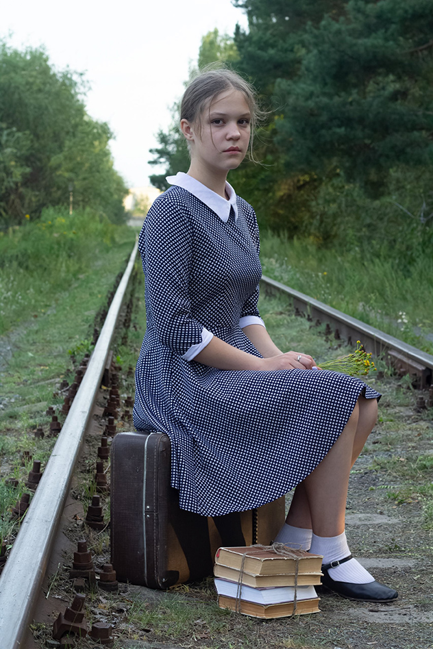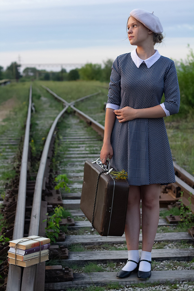 Под эту съемку тоже нужен был определенный типаж девушки. Было много желающих, но подошла сюда именно эта девочка. Автору всегда хотелось кого-нибудь поснимать на рельсах. Как в детстве: ходили гулять, посмотреть на поезда. Получилась история как будто девочка идет несколько километров учиться в другой город. Ей тяжело, не знает, что будет дальше.