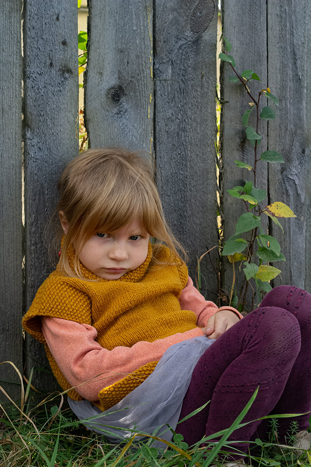 А эти снимки получились спонтанно. Шли на субботник. Братья поругались с младшей сестренкой Есенией. Защипали ее с двух сторон. В итоге девочка обиделась, не хотела никуда идти, присела у забора. Получилось поймать живые неподдельные эмоции девочки.