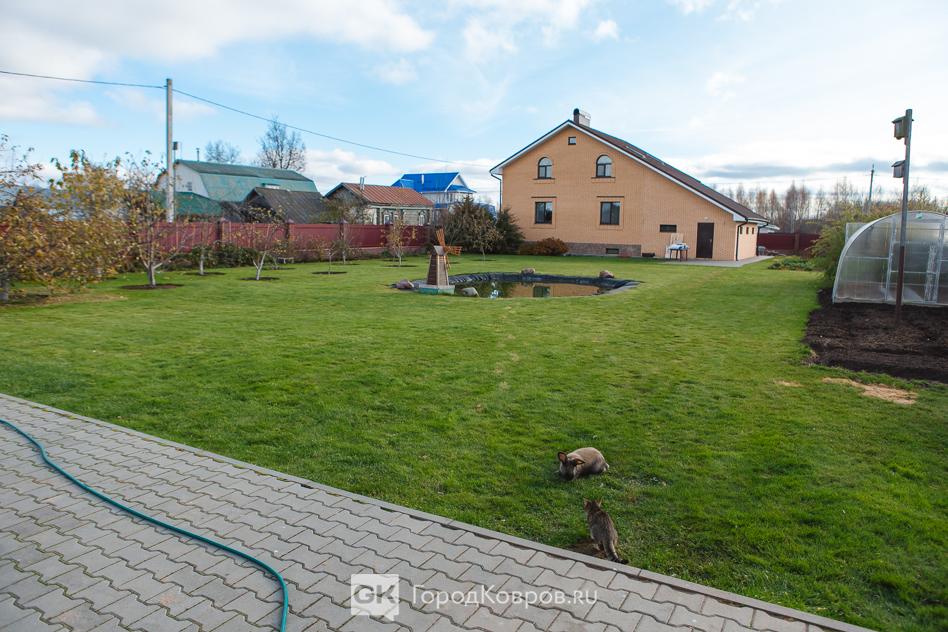 Арсений встретил нас во дворе родительского дома. И это не огород! Участок оформлен по-европейски. Минимализм, небольшой искусственный водоём в центре и блок построек для содержания животных, собственно, ферма.