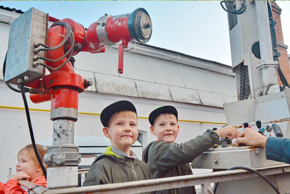 На улице экскурсанты обступают пожарно-спасательную технику, изучают пожарные стволы, гидравлический инструмент, пытаются управлять лафетным стволом на автоколенчатом подъемнике.