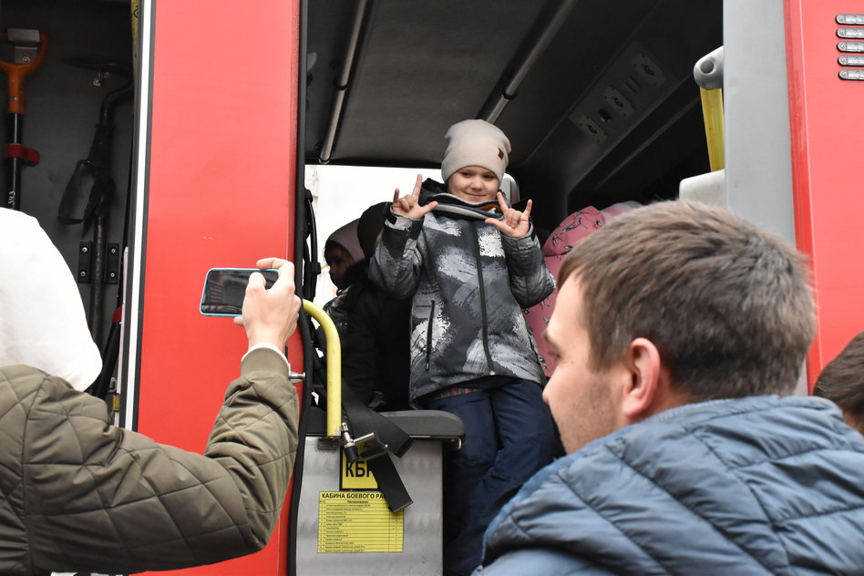 Дети в это время примеряли боевую одежду пожарных и каски, осваивались в кабине боевого расчета нового современного автомобиля Розенбауэр и заслужившего уважение за долгую безупречную работу ЗиЛ-130.