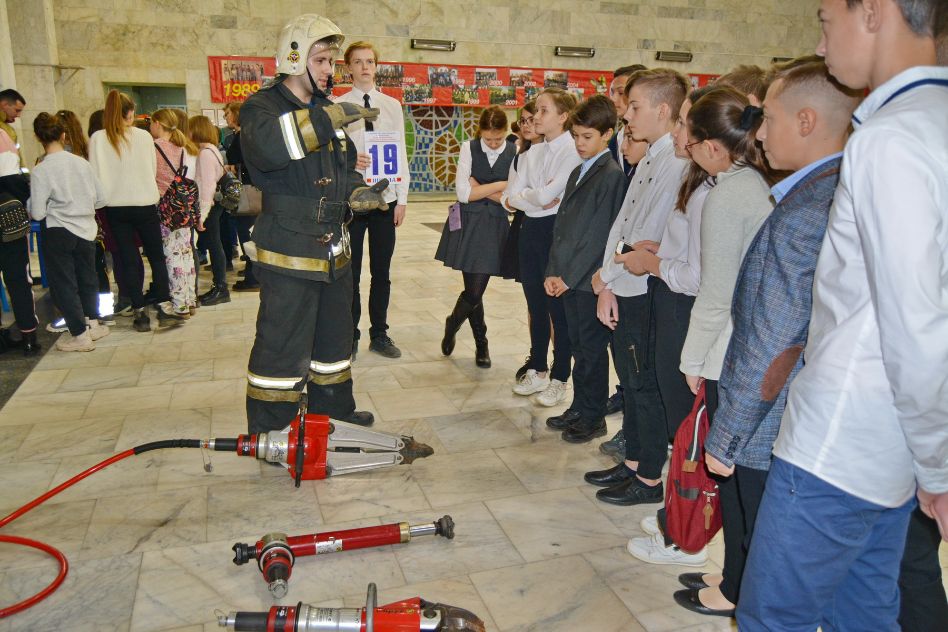 Первой частью праздника стали мастер-классы по безопасности — 17 учебных точек расположились в мраморном зале и на втором этаже ДК. Здесь пожарные, спасатели, представители ГОЧС рассказывали ребятам о тонкостях своих профессий.