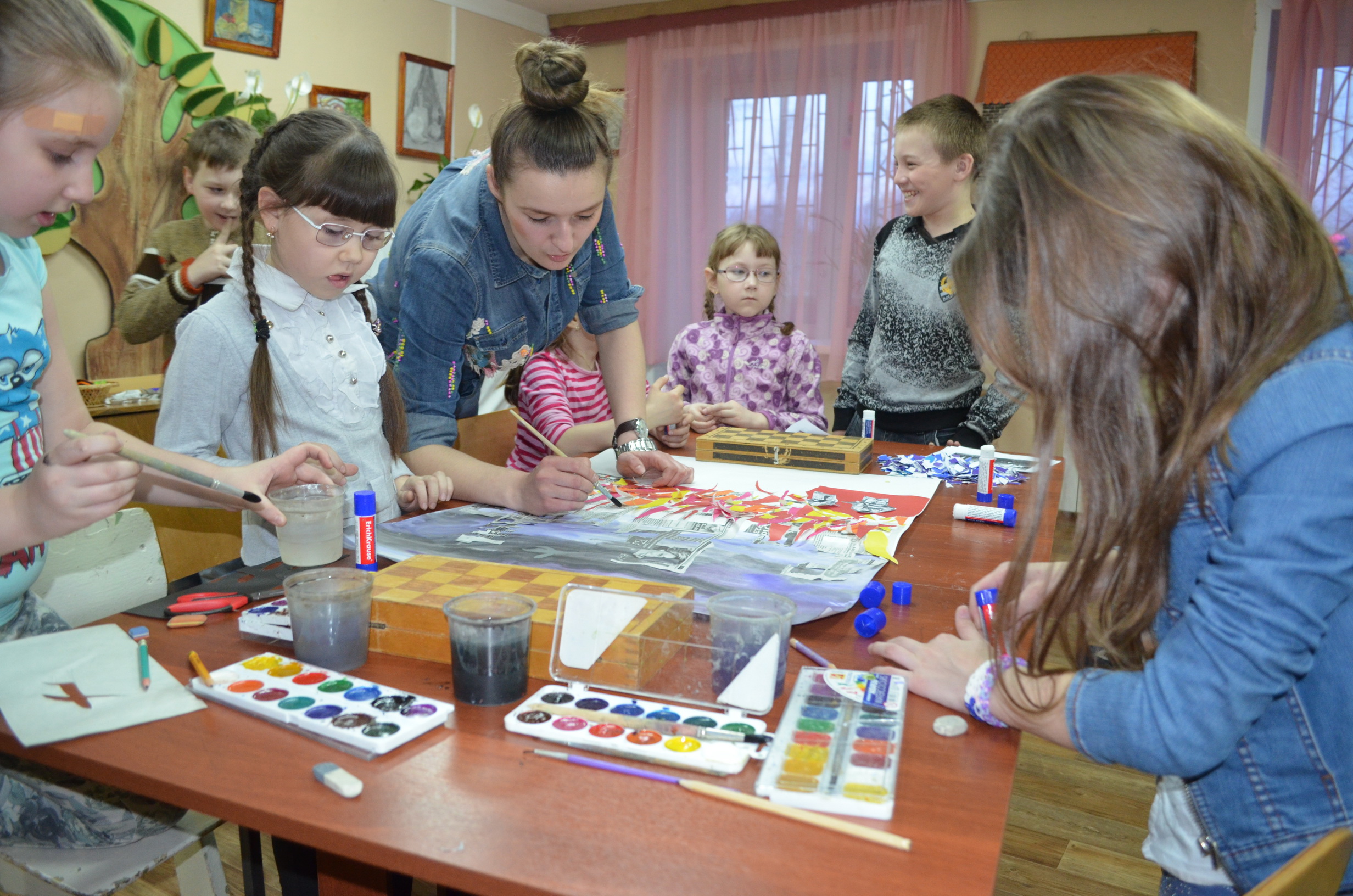 Проникшись атмосферой военных годов, ребята и взрослые смастерили потрясающий коллаж. Вначале было не понятно, как газеты, клочки разноцветной бумаги, вырезанные из фотографий силуэты пожарных и акварельные краски, можно собрать воедино. Но когда над этой кучей творческих элементов стали колдовать руки юных художников, постепенно стал вырисовываться сюжет картины – разрушенные дома, объятые огнем и дымом и пожарные, отстаивающие у пламени города.