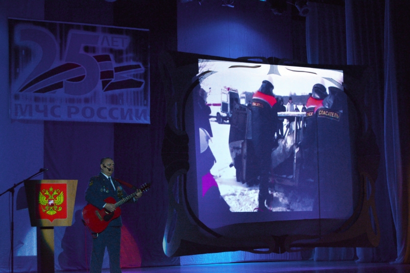 Песню «Спасатель» собственного сочинения исполнил ветеран пожарной охраны Николай Смирнов. А когда на экране появились фотографии с мест проведения аварийно – спасательных работ, портреты пожарных и ветеранов, весь зал аплодировал им…
