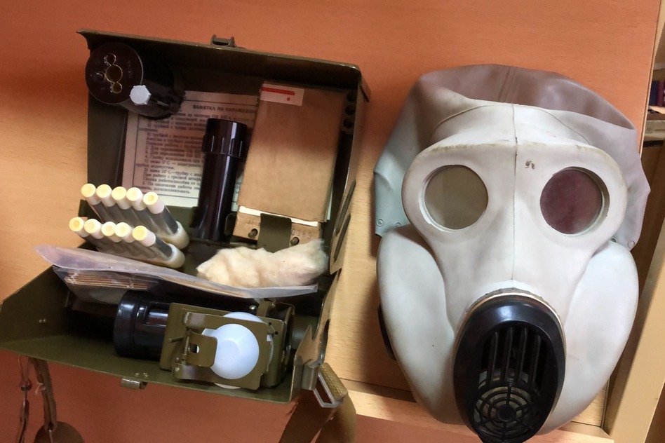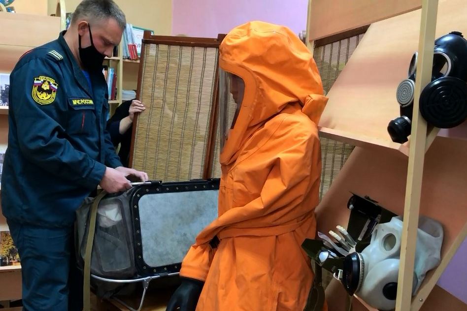 В период пандемии масштаб выставки пришлось изменить – теперь экспозиция встречает гостей на входе в библиотеку. Сегодня это манекен-спасатель в термоагрессивостойком костюме, противогазы различных модификаций, капсула защитная детская и прибор войсковой химической разведки.