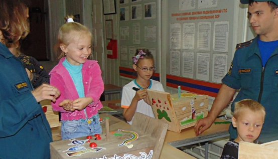 С утра, в пожарной части № 14, для ребят была проведена увлекательная экскурсия, после которой в учебном классе начался урок мастерства. Пожарные, вместе с детишками, украшали птичьи домики. Можно было выбрать любой материал и придумать свою композицию.