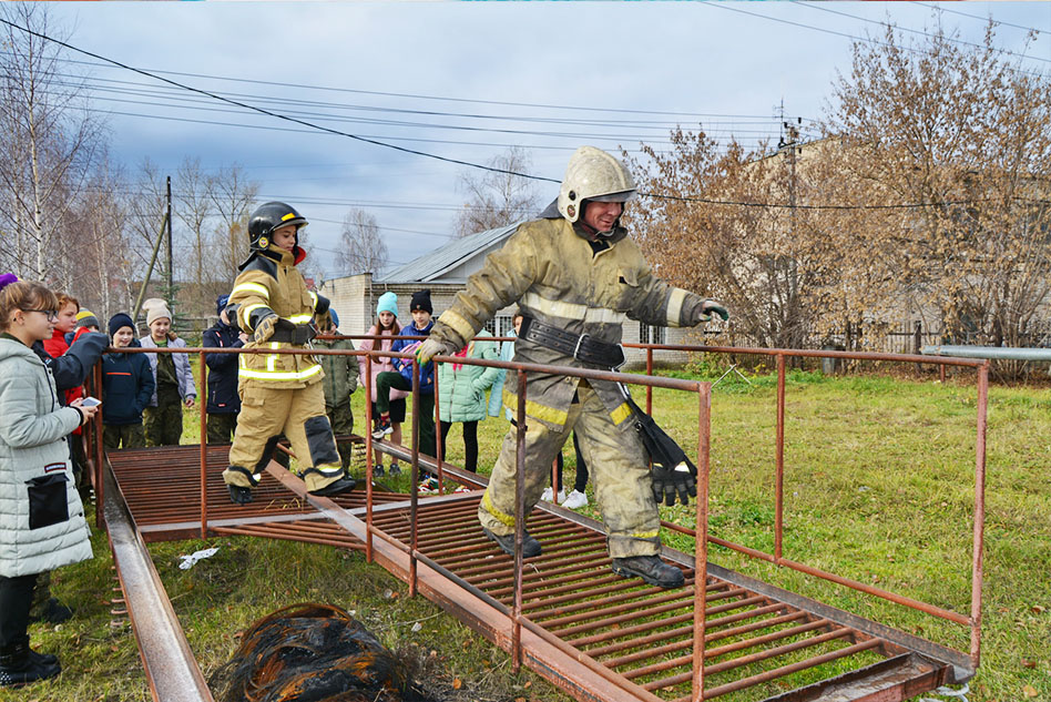 По просьбе учителя ОБЖ Дмитрия Козинова пожарные разрешили ребятам пройти по всем этапам психологической полосы. Как положено, в боевой одежде и с инструктором, Максим покорял все этапы тренировочного полигона. Но дети есть дети, и одноклассникам Максима тоже не терпелось всё попробовать и они, не дожидаясь своей очереди, один за одним, пошли преодолевать препятствия.