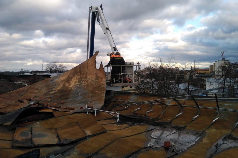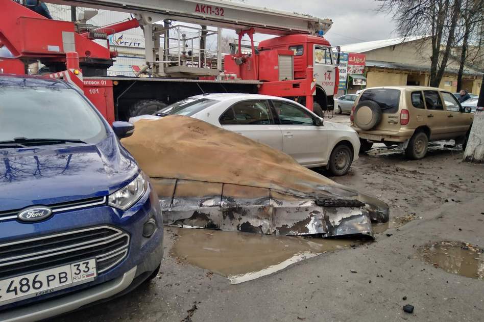 Сегодня весь день во Владимирской области бушует сильный ветер. В Коврове он уже успел натворить неприятностей — сорвал металлический лист со сгоревшей кровли дома № 10 по ул.Социалистическая, повредив два автомобиля. Спасатели поисково-спасательного отряда МКУ УГОЧС города Коврова и автоколенчатый подъемник на данный момент работают на месте происшествия, спасатели укрепляют металлическую кровлю, которая была повреждена пожаром, а те элементы, которые могут быть снесены ветром, срезают и спускают на землю.