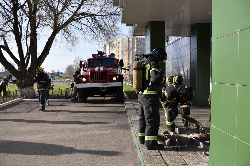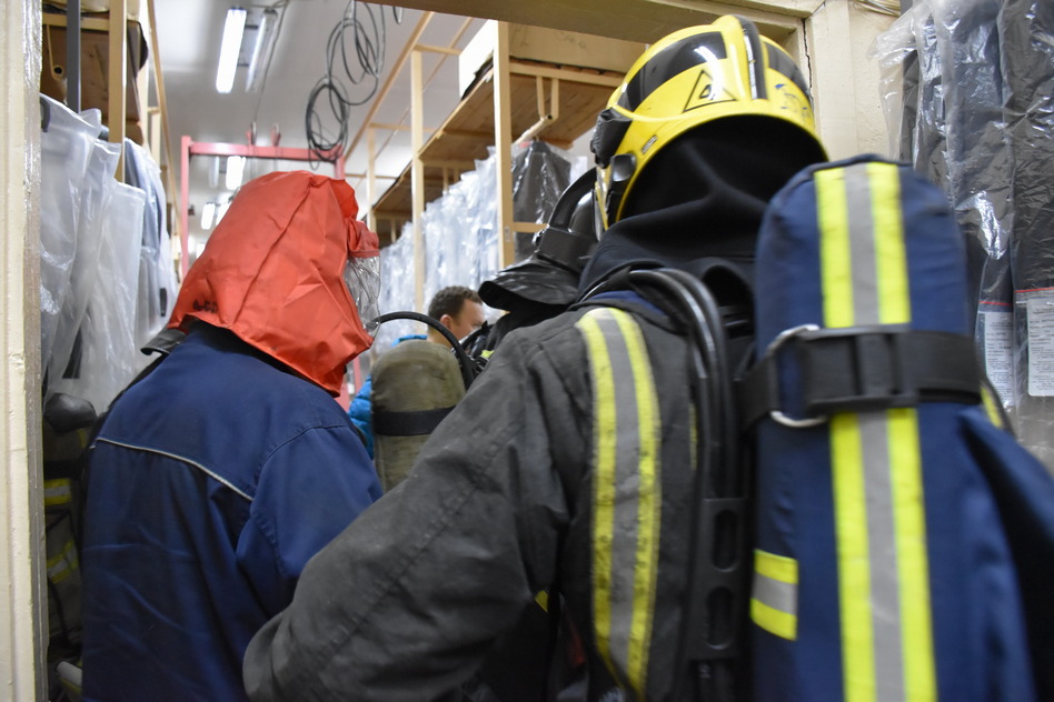 Согласно тактическому замыслу учений условный пожар возник на складе готовой продукции на 1 этаже, дым начал подниматься на верхние этажи. Работники, получив информацию о месте пожара, быстро сориентироваться и воспользовались теми эвакуационными выходами, которые не заполнены дымом и находятся далеко от очага возгорания.