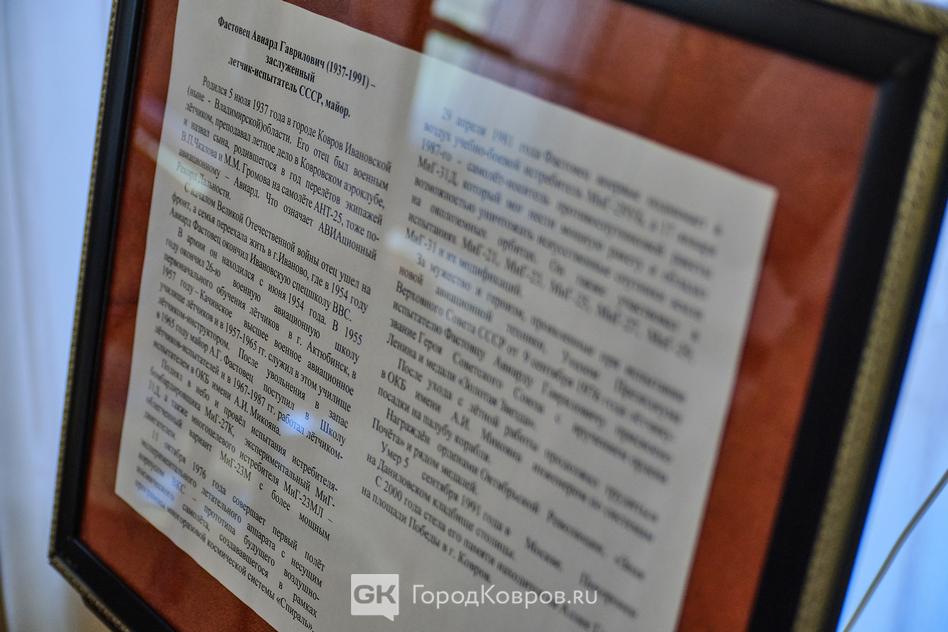 В ковровском историко-мемориальном музее Владимирской области много нового. Новая выставка, посвященная 85-летию летчика-испытателя Авиарда Фастовца. И обновлённый формат, в котором экспонаты представлены вниманию посетителей.