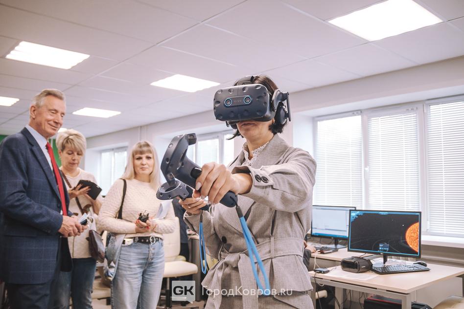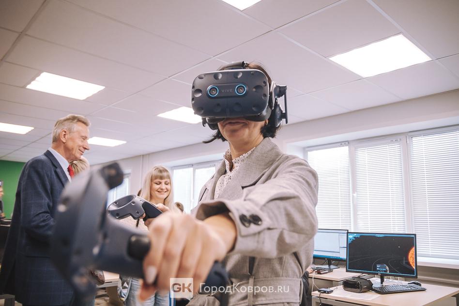 Городское руководство не ограничилось приветственными речами, первые лица на себе решили проверить цифровое оборудование. Главе Коврова особенно понравились VR-очки.