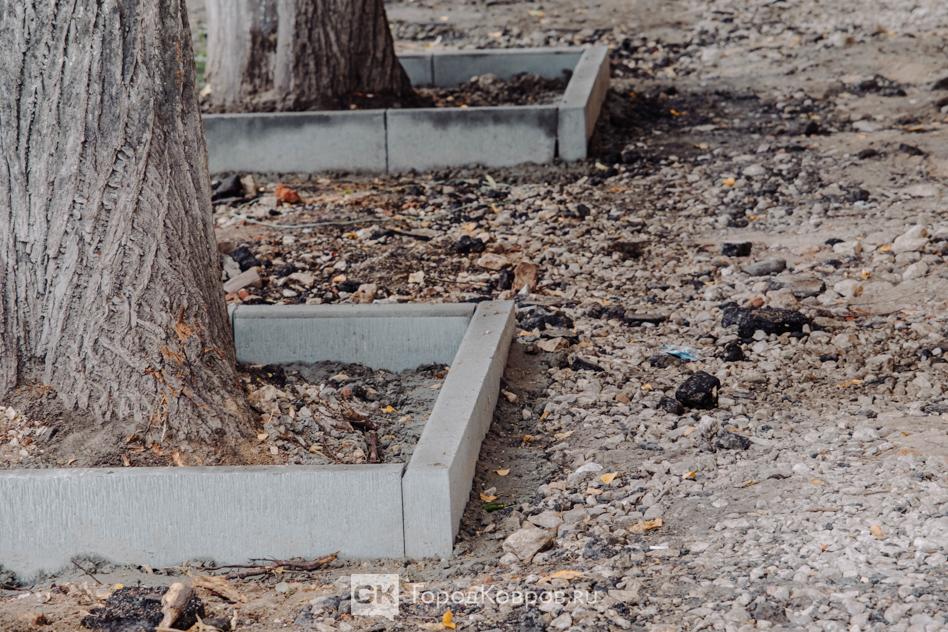 Сейчас дорожники в стадии подготовительных работ. Обломки старого тротуара удалены, место будущего тротуара сейчас представляет собой «песочницу».