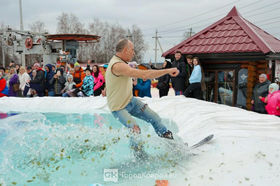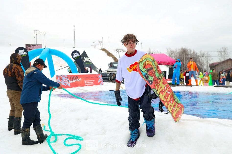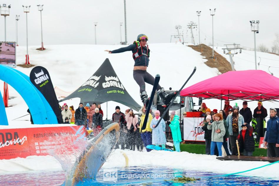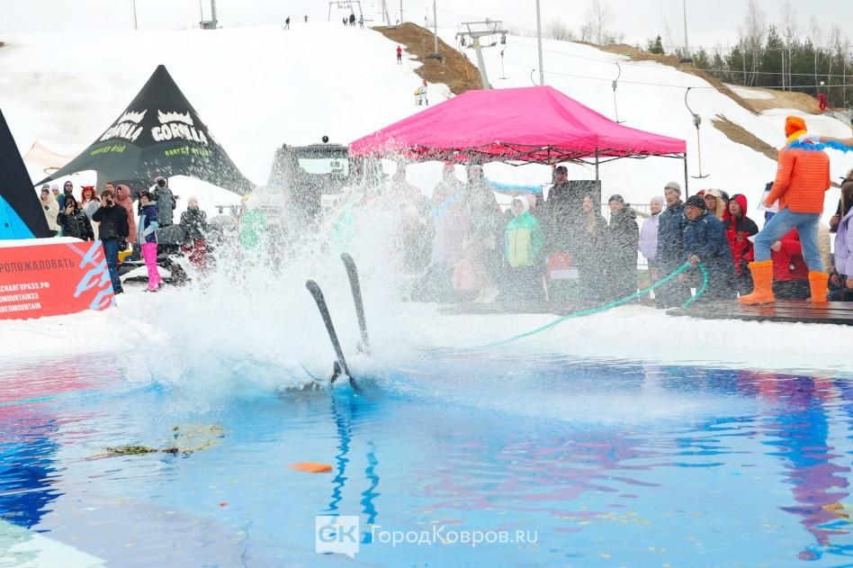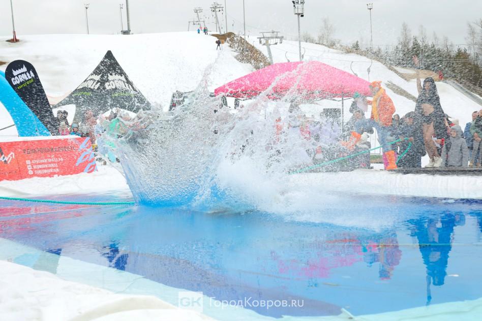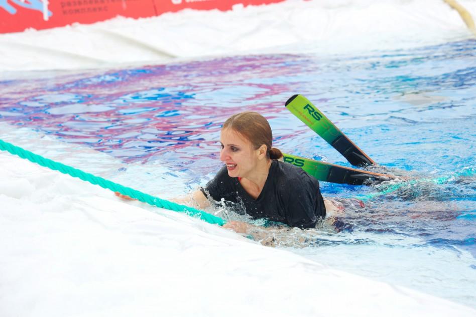 Слетали в бассейн все настолько стремительно, что многие участники оставляли лыжи, палки, сноуборды и детали костюмов в воде. Но с этим ловко справлялись работники «Красной Горы». А участники им нередко помогали отлавливать из воды утраченные аксессуары.