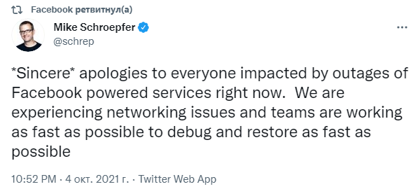 Всё началось 4 октября в 15:40. Что-то напоминает… Работа сервисов Facebook, Massenger, Instagram, WhatsApp прекратили свою работу на 7 часов. Эту ситуацию стразу прокомментировал в своём Твиттере технический директор Facebook Майк Шрёпфер:
