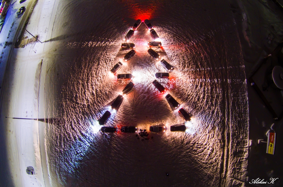 Субботний вечер. Пока многие были заняты своими делами, 24 отважных водителя поехали участвовать в флешмобе. Несмотря на то, что обычно в акции участвуют более 50 машин. Наши за два часа сумели создать ёлку и снежинку.