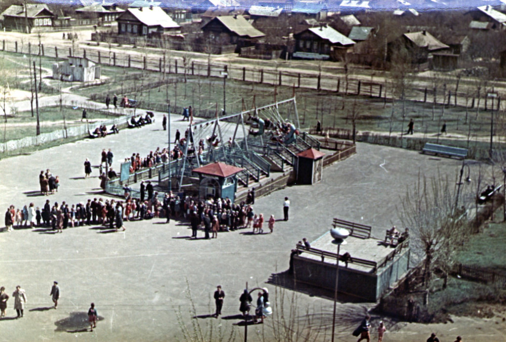 Узнаёте школу №11? А старые, также демонтированные в 90-х, аттракцион «лодочки»? И это место, без сомнений вам знакомо. Сейчас бы в кадре оказалась детская площадка:
