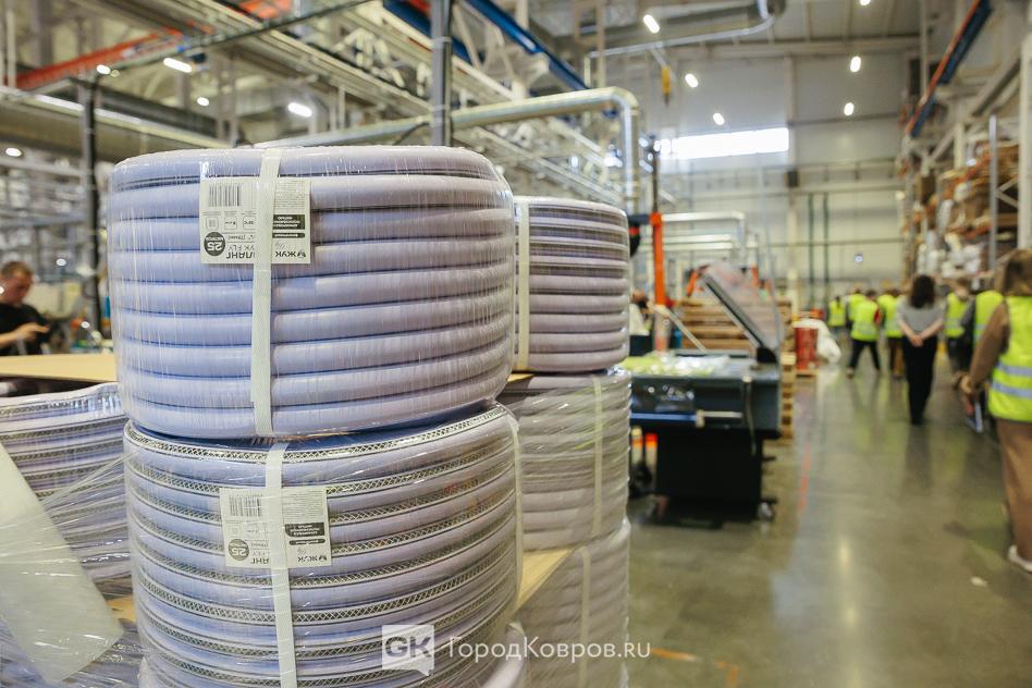 Мы задержались на линии по выпуску садовых шлангов. Готовые к отгрузке шланги были скручены в бухты и представляли собой компактный кубик со скруглёнными углами. Немного напоминало инвентарь для фитнес-зала. Александр Игоревич пояснил, что шланги наполнены сжатым воздухом. Это придаёт упаковке жёсткость, что обеспечивает целостность при транспортировке.