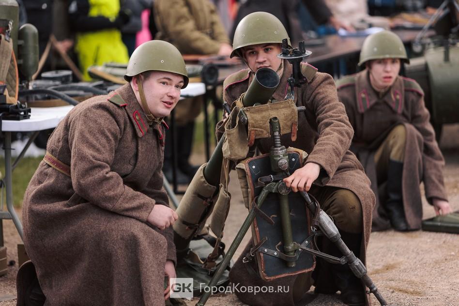 - «У нас сегодня участвует мотоцикл М-72 с публемётом, автомобиль ГАЗ-76Б с пулеметом СГ-43, бронеавтомобиль БА-20 с пулеметом дегтярева танковым, 45-мм орудие, 82-мм миномет, стрелковое вооружение и пртивотанковое ружье ПТРД. Задействовано около 20 человек — все они наши одноклубники, «Наследники Победы». Все занимаются реконструкцией много лет.».