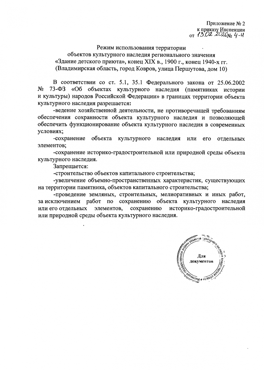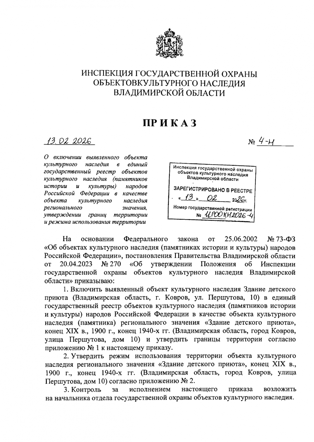 Старинный особняк на улице Першутова, 10, хорошо знакомый многим поколениям ковровчан, официально признан объектом культурного наследия. Соответствующий приказ подписала Инспекция государственной охраны объектов культурного наследия Владимирской области. Документ утверждает включение «Здания детского приюта» в единый государственный реестр памятников истории и культуры народов России .