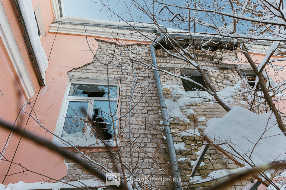 Штукатурка на фасаде существенно пострадала, обвалилась крупными фрагментами. Кстати, это говорит о том, что капитальный ремонт, который проводили на здании в середине нулевых (относительно недавно), по факту оказался не слишком качественным.