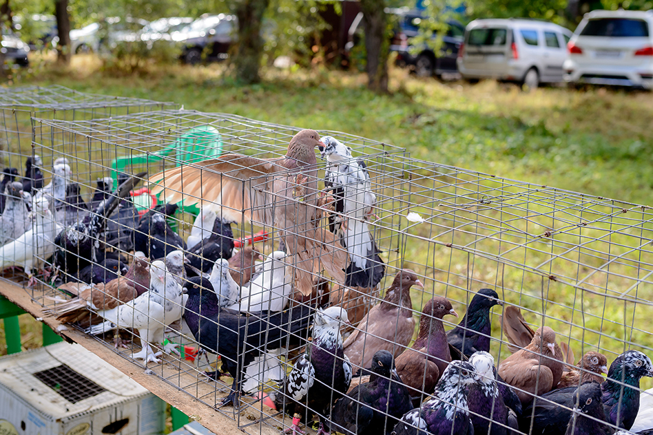 Статные — это не комплимент, а классификация — один из видов подгруппы «Трясуны». Несмотря на то, что весь «фест» уместился на небольшом пятачке-полянке на Сенной площади, от количества пород буквально рябило в глазах. Участники перечисляли представленные разновидности. Помимо упомянутых луганских, были ещё и донецкие, были мурые. Про этих пёстрых птиц говорили, что изначально заводчики у них из Мелитополя. А ещё называли бакинских бойных. Но это не про бойцовский клуб. У голубей, как мне пояснили, боёв не проводят, это вам не петухи. Просто характер у бакинцев боевой…
