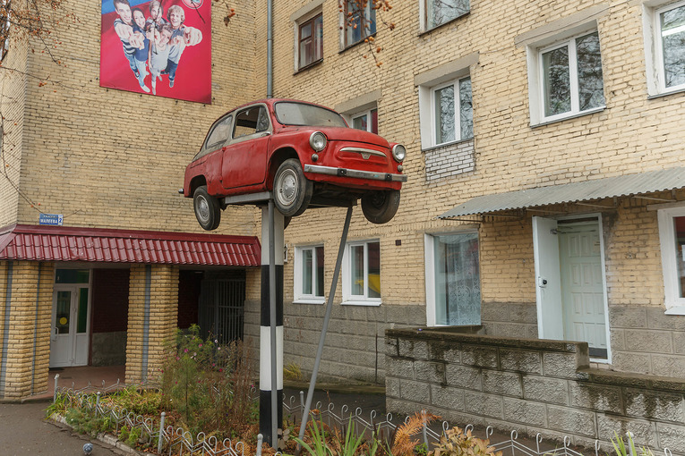 А вот этот объект у транспортного колледжа имеет все шансы попасть в книгу каких-нибудь рекордов. Ему много лет и каждый год меняет цвет: был жёлтым, серым, зелёным… Сейчас красный. Да, это автомобиль «Запорожец». Мы застали раритет и достопримечательность города с разбитым боковым стеклом. «Саша, Паша, Дима»?