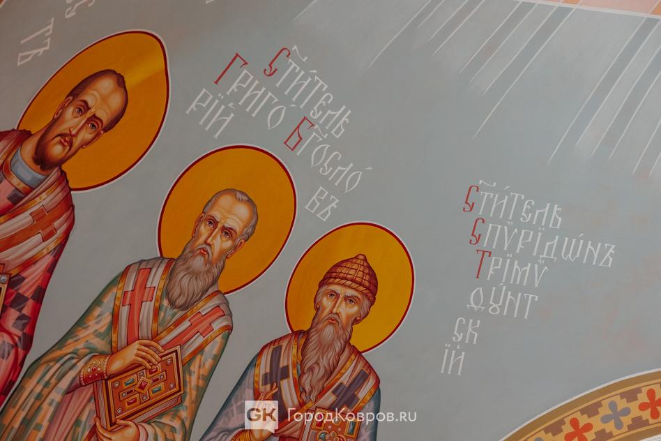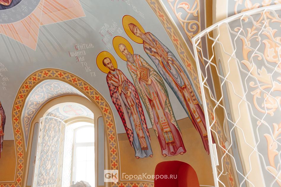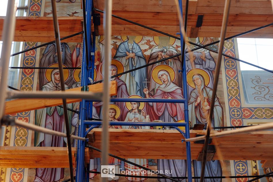 Павел Рачков пишет лики. Сейчас выполнена одна из стен, как мне сказали, «женская» — на ней изображены святые угодницы. Будет ещё «мужская стена». Автор фресок, как оказалось, имеет приличный опыт. Павел рассказывал: