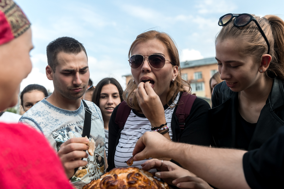 Встречали иностранных артистов образцовый ансамбль народной песни «Ярмарка». Встречали песнями и, конечно же, караваем.