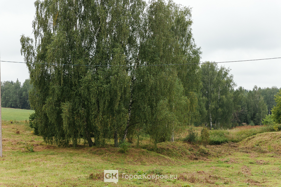 Вообще пейзаж деревни очень необычный. Из-за весёлой речки изменился весь рельеф, местность получилась холмистой. Деревья здесь растут необычайно мощные! Вот в этом месте, например, было раньше бомбоубежище с деревянной крышей, которое местные построили сами. Потом на крыше выросли берёзы, такие сильные, что крыша провалилась. Строение развалилось. А деревья растут до сих пор.