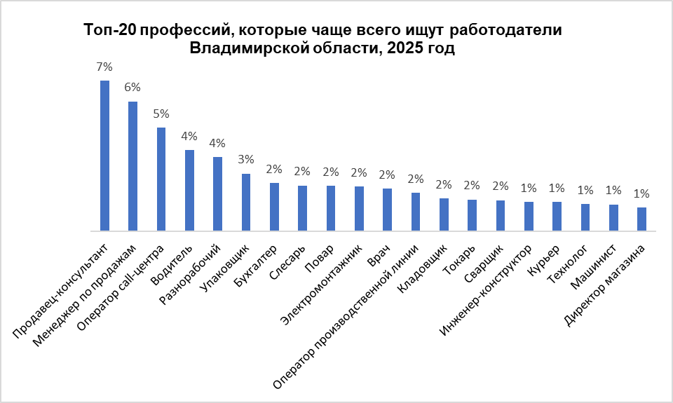 По итогам семи месяцев 2025 года работодатели Владимирской области разместили 51,9 тыс. вакансий. Лидерами по востребованности стали продавцы-консультанты и продавцы-кассиры — для этих специалистов на hh.ru было опубликовано 3,8 тыс. предложений, что составляет 7% от общего числа рабочих мест в регионе.