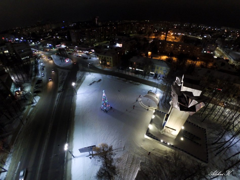 Итак, любуемся видами с высоты! Снято, между прочим, с помощью квадрокоптера. Рискованная съёмка, как ни крути. Вот главная новогодняя ёлочка и площадь 200-летия: