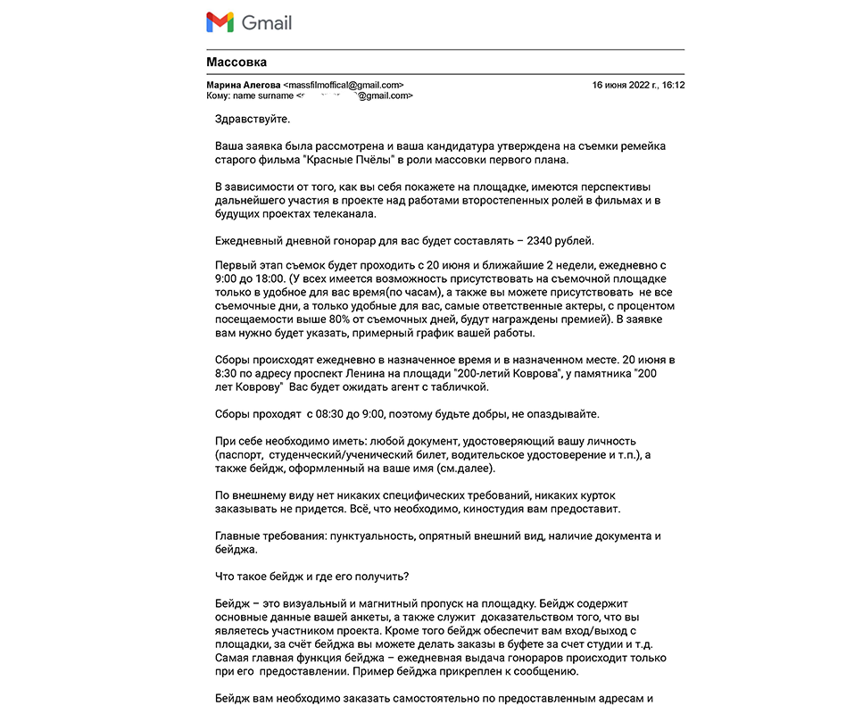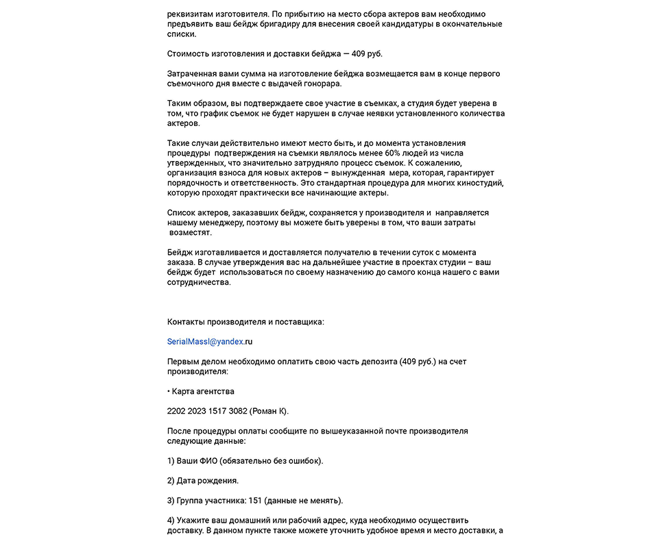 Если вы, читающие данный текст, ещё не отправляли заявку по электронному адресу massfilmoffical@gmail.com, рекомендуем ознакомиться с содержанием форума Развод от castformovieru@gmail.com и прочих.