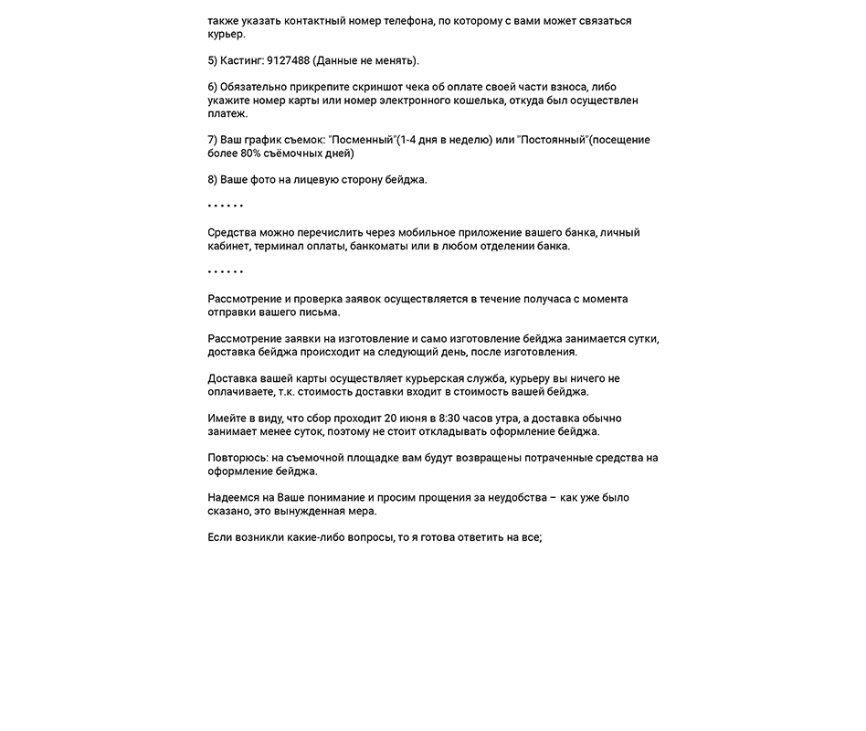 Уважаемые друзья, мы не имеем возможности провести полноценные кастинги на роли первого и второго плана. Подбор всех артистов проводится исключительно дистанционно через интернет. На почту и в социальные сети кастинг менеджерам приходит огромное количество заявок на участие. К сожалению больше половины людей НЕ ПРИХОДИТ на съёмки , в результате имеется печальный опыт сорванных съемок, потерями времени, огромных средств и репутации компании. Плюс мы тратим деньги на ИМЕННУЮ магнитную карту ТОЛЬКО для вас. По которой вы заходите и выходите с площадки, получаете еду и напитки. Процедурой подтверждения человек подтверждает, что он действительно ПРИДЕТ на съемки и его магнитная именная карта стоимостью больше 3х тысяч рублей не пропадет, как бывало не один десяток раз. Таким образом, работодателю гaрaнтируется, что наберется необходимое количество актеров. Бывает, что даже из-за нескольких актеров второго плана съемка шла наперекосяк. Для прохождения процедуры подтверждения необходимо внести 500 рублей напрямую на официальный счет ассистента и исполнительного продюсера по которому возвращаются средства при входе в театр.