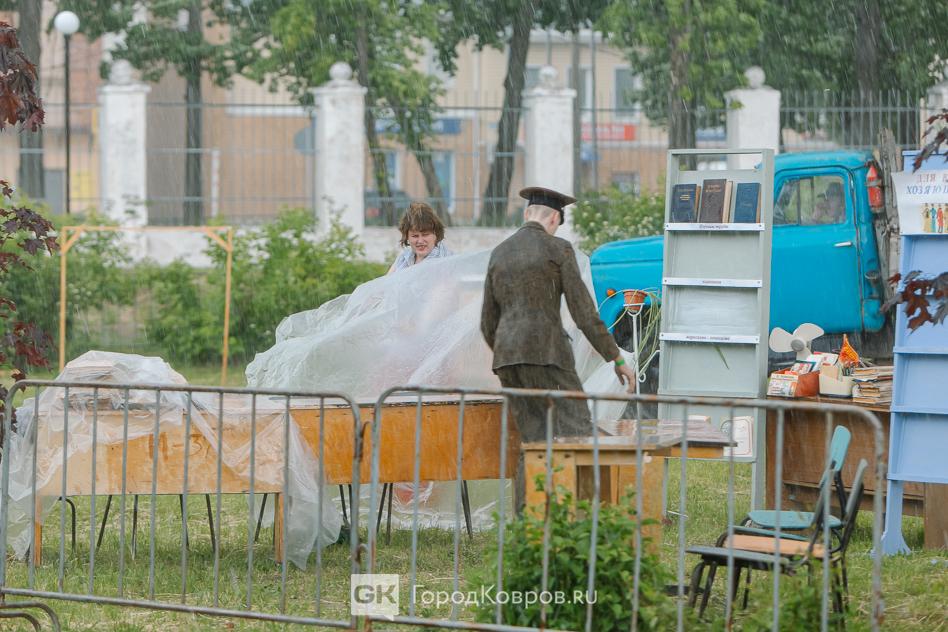 Несмотря на резко испортившуюся погоду, реконструкция не остановилась. Зрителей дождь особо не напугал, а вот что касается актеров, то некоторым пришлось лишь добавить немного «современности» к костюмам в виде дождевиков.
