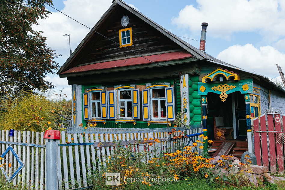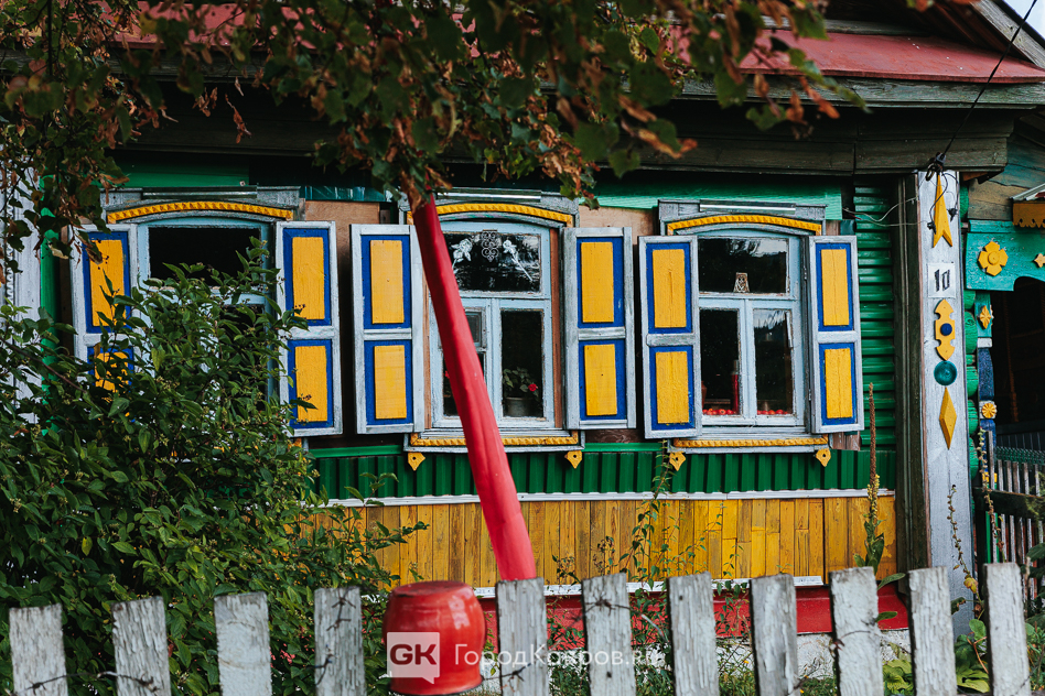 Среди тех домов, что устояли и уцелели, попадаются интересные конструкции. Аккуратный «пряничный» домик с садом камней у ворот и загадочными алыми лентами на деревьях в саду — это дом Николая. Пожилой мужчина когда-то был деревенским почтальоном. Затем с работы ушёл и увлёкся хендмейдом и каким-то духовными практиками. Что за стиль и что за идеи, жители деревни не понимают. Николай, когда с работы ушёл, обособился — живёт один, на своей волне.