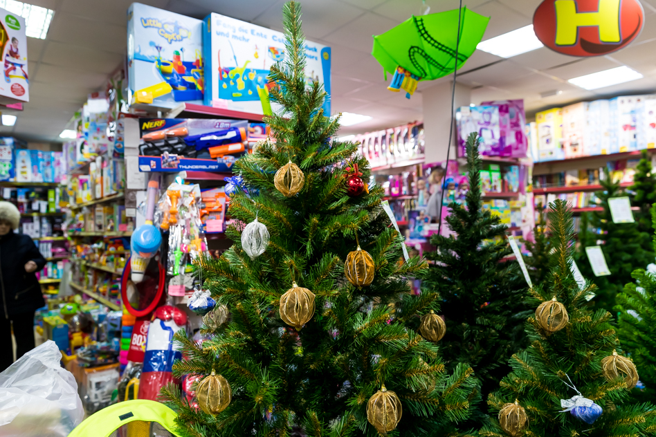 Первый наш экскурс — МУП «Первомайский рынок». Ещё в том году ёлки продавали прямо на улице. И за тысячу рублей можно было купить если не огромную кремлёвскую, то хотя бы саетиметров 50, чтобы только поставить на шкаф, для галочки — вполне себе реально. А сейчас там — только сезон валенок, варежек и меховых шапок. Ну, кое-где можно гирлянду и новогодние шарики со скидкой урвать.