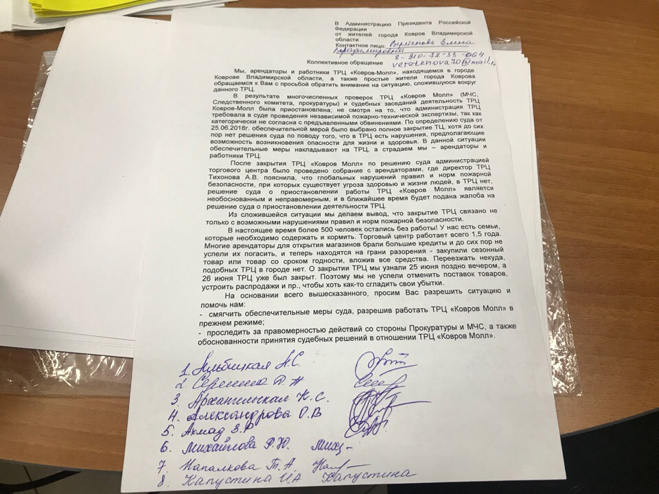 В социальных сетях предложили подписать петицию о снятии ограничительных мер с торгового центра «KOVROVMALL». О сборе подписей в сети, мы уже рассказывали. Здесь речь пойдет о реальных ручке и бумаге.