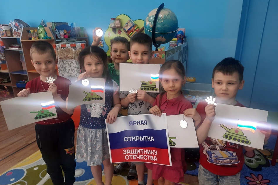 Таким образом, ребята не только подготовили поздравительную открытку для пап, дедушек и братьев, но и познакомились с новым для себя «волшебным» материалом – световозвращающей бумагой, которая при попадании на нее источника света светится в темноте.