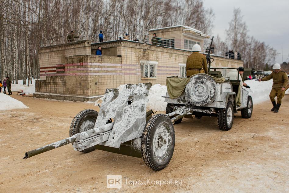 От нас на реконструкции был расчет противотанкового орудия «Сорокопятка» — 4 человека, бронебойный расчет с противотанковым ружьём — 2 человека, тягач орудия ГАЗ-64 с установленным на нём станковым пулемётом Сг-43 — 2 человека, минометный расчет — 3 человека, огнемётный расчет — 2 человека и 4 человека морских пехотинцев.