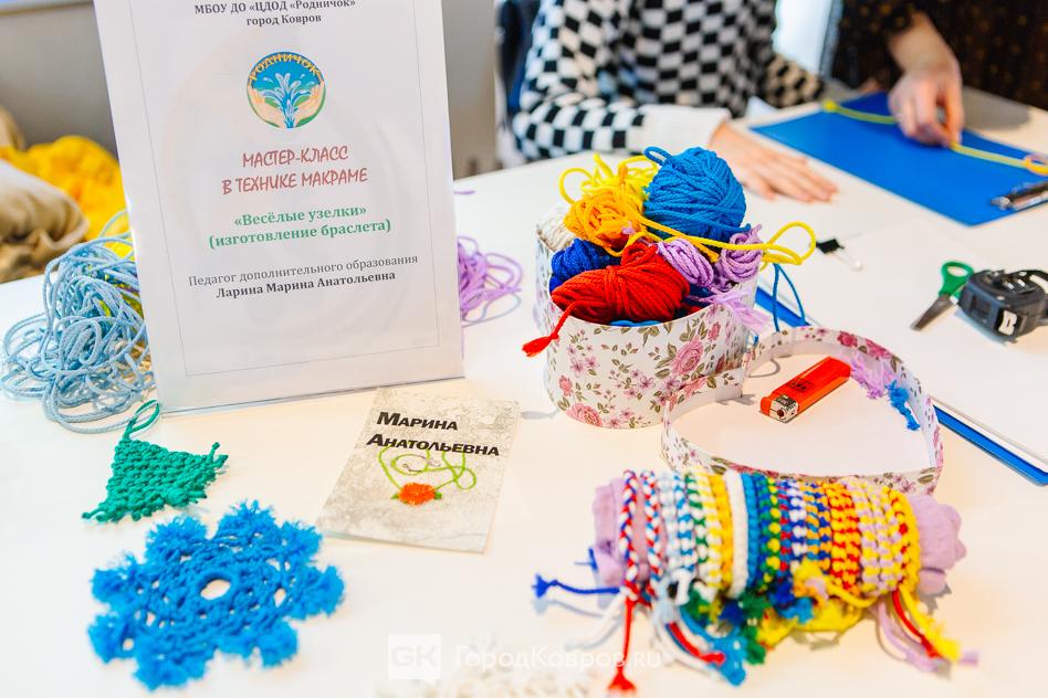 …У стола Марины Лариной народ всё прибывал. Желающих освоить технику макраме в нашем городе, как выяснилось, очень много. За всё время МК, с полудня до шести вечера, базовое обучение прошло более 25 девочек. Трое из них решили продолжить занятия и в январе придут к Марие Анатольевне в МБОУ ДО » ЦДОД «Родничок». В объединении «Весёлые узелки».