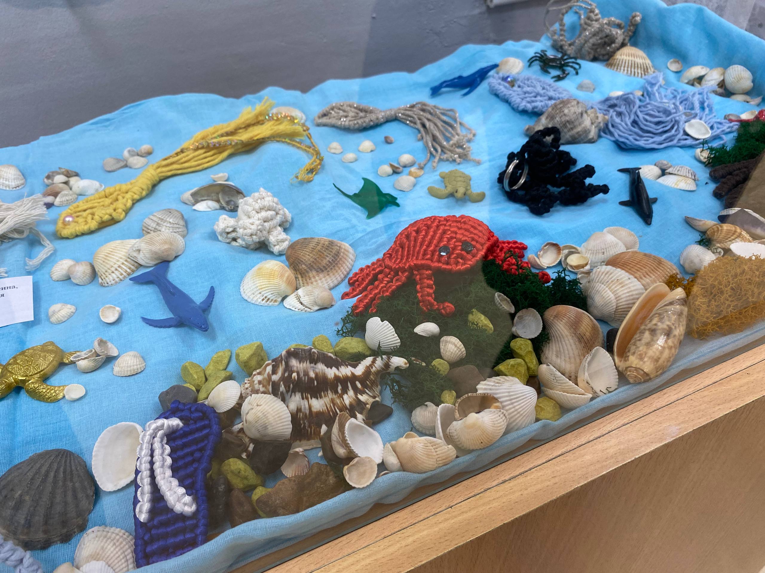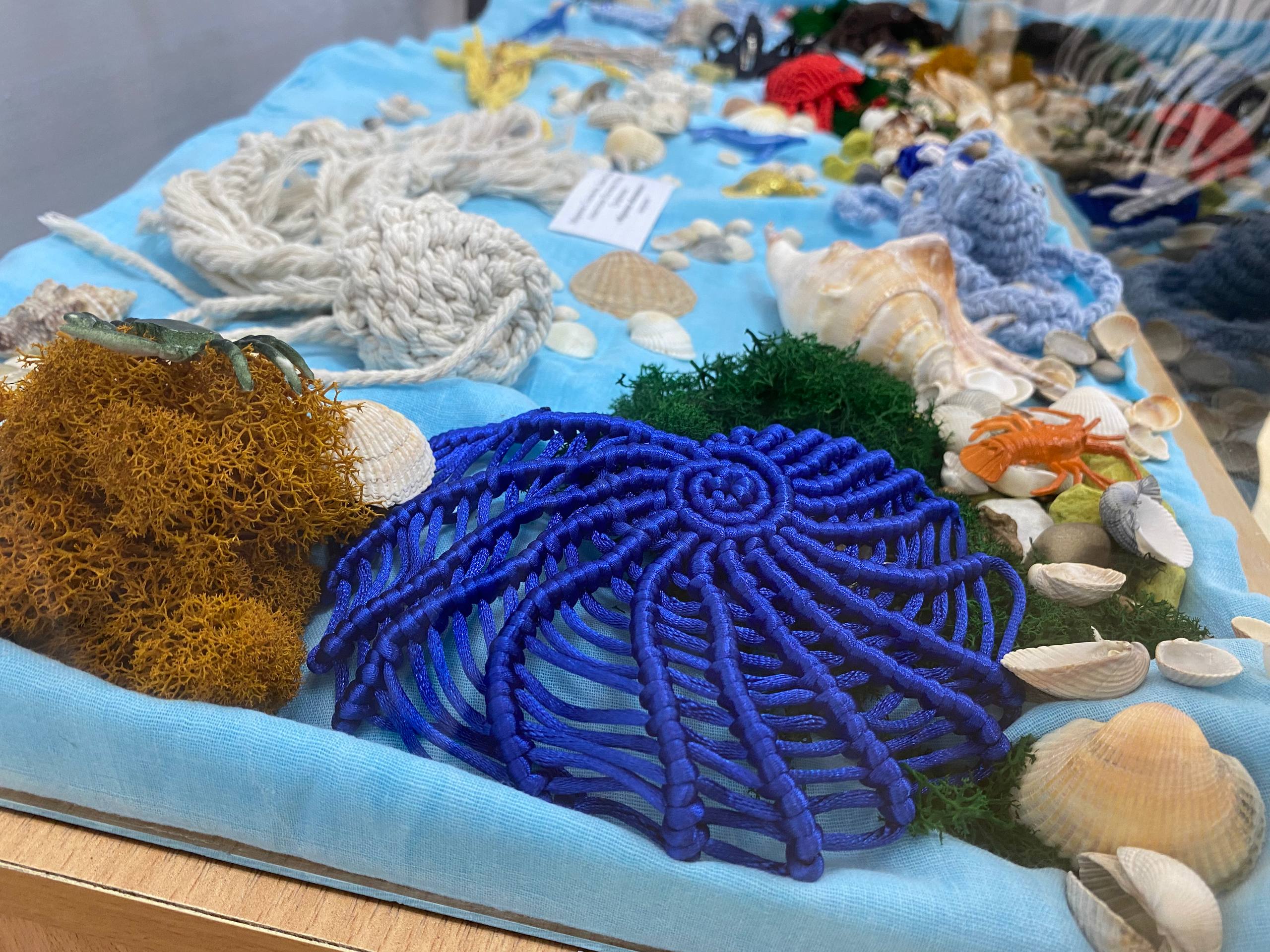 На выставке помимо абажуров, панно и декоративных подвесов Юлия подготовила макраме-аквариум. В нём — морские обитатели из нитей: крабы, медузы, ракушки, рыбки. Детали хочется рассматривать, они сразу привлекают внимание.